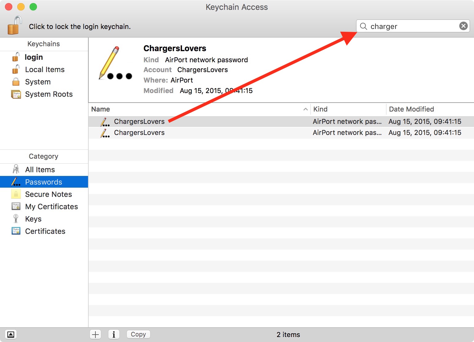 Apple naprave Wi-Fi gesla shranjujejo v Obesku s ključi (Keychain), do katerega lahko dostopate preko aplikacije Dostop do obeska s ključi (Access Keychain). Pritisnite kombinacijo tipk CMD+Preslednica za odprtje Ospredja, kjer lahko najdete aplikacijo Dostop do obeska s ključi. Le to odprite. Nato uporabite vrstico za iskanje za najdbo katerega koli Wi-Fi omrežja, s katerim ste bili kadarkoli povezani.