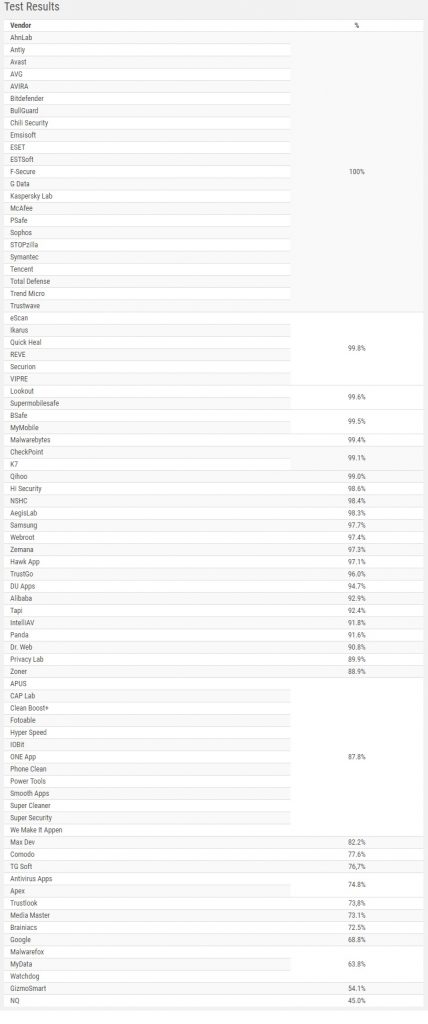 Rezultati so presenetljivi. Da bi preprečili morebitne napake, je bilo med preizkusom podrobno analizirano, kaj posamezni program dejansko počne med tem časom. Kar nekaj se jih je posluževalo metode, kjer se je izpisal napis SCAN, telefon pa je veselo pričel proces zaznavanja. A žal se je v ozadju skrivalo neprijetno presenečenje, saj je šlo za predefinirano časovno skripto, ki se je izvajala določen čas in zgolj preverila število datotek na mobilniku. Da bo mera popolna, je kar nekaj izmed programov želelo “zaščititi” uporabnika in same sebe zaznalo kot škodljivo kodo (niso bili dodeljeni pod varne aplikacije).
